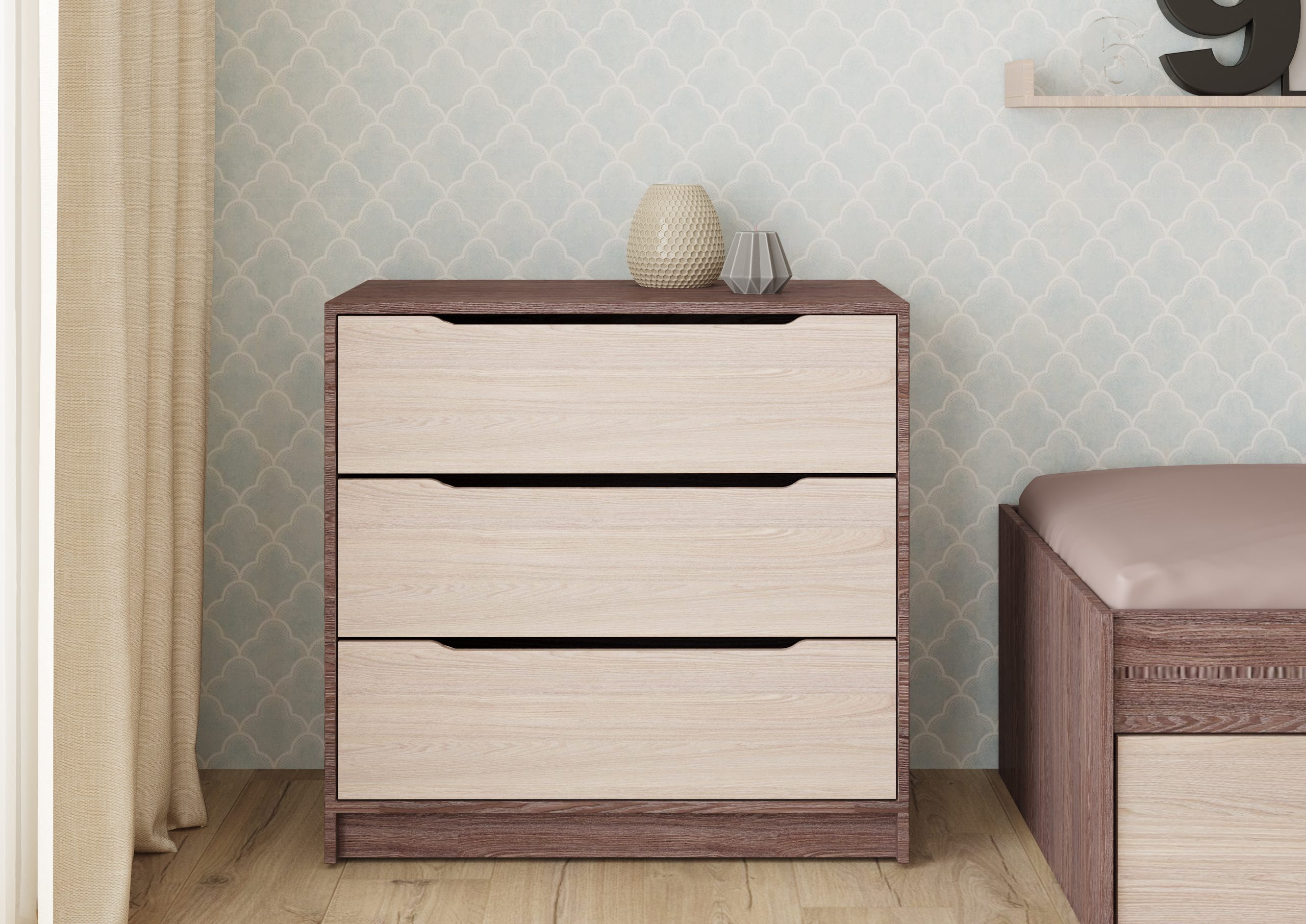 Компактный комод с интегрированными ручками отлично впишется в интерьер спальни или прихожей.