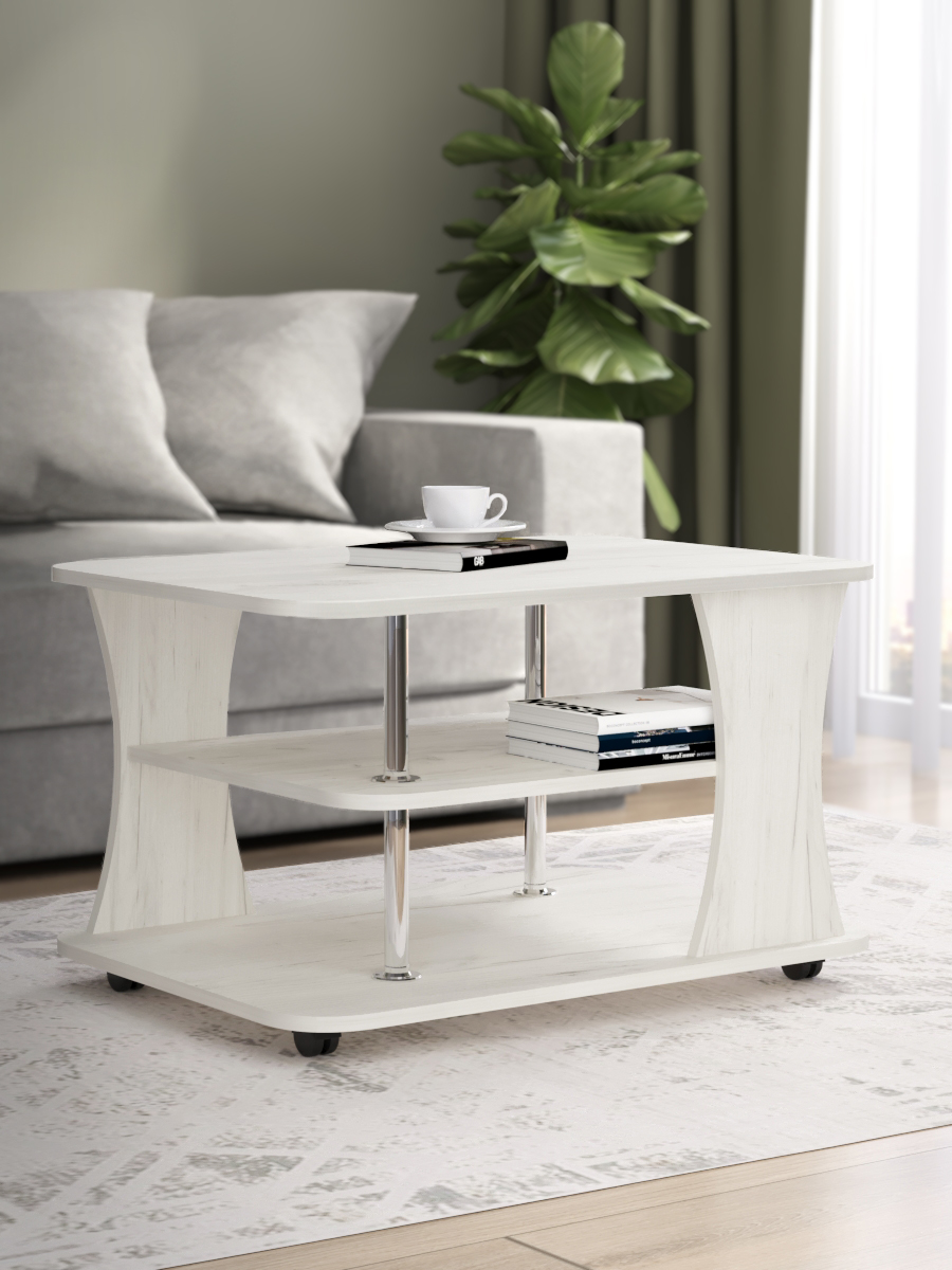 Колесики позволят легко передвигать стол по комнате, а полки подойдут для хранения книг, журналов и мелких предметов.